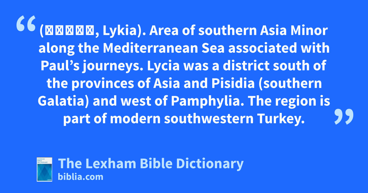 Lycia (Λυκία, Lykia). Area of southern Asia Minor along the Mediterranean Sea associated with Paul’s journeys. Lycia was a district south of the provinces of Asia and Pisidia (southern Galatia) and west of Pamphylia. The region is part of modern southwestern Turkey.