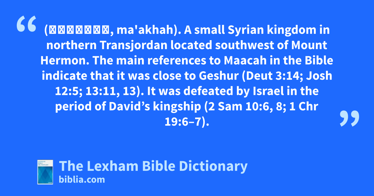 Maacah, Place (מַעֲכָה, ma'akhah). A small Syrian kingdom in northern Transjordan located southwest of Mount Hermon. The main references to Maacah in the Bible indicate that it was close to Geshur (Deut 3:14; Josh 12:5; 13:11, 13). It was defeated by Israel in the period of David’s kingship (2 Sam 10:6, 8; 1 Chr 19:6–7).