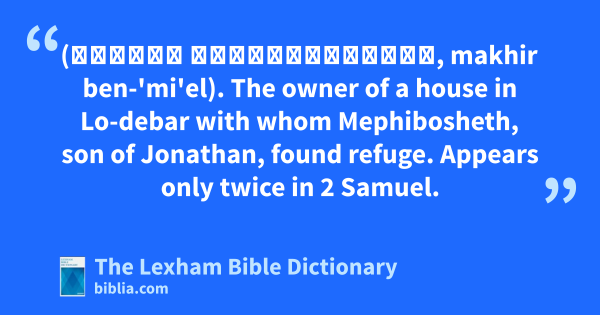 Machir, Son of Ammiel (מָכִיר בֶּן־עמִּיאֵל, makhir ben-'mi'el). The owner of a house in Lo-debar with whom Mephibosheth, son of Jonathan, found refuge. Appears only twice in 2 Samuel.