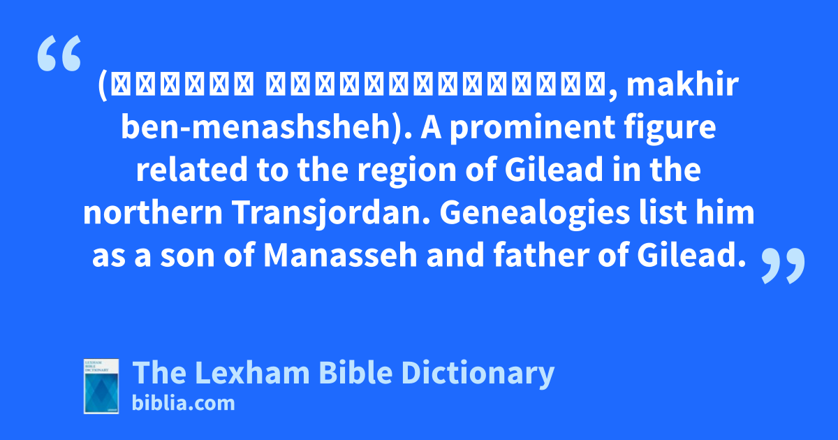 Machir, Son of Manasseh (מָכִיר בֶּן־מְנַשֶּׁה, makhir ben-menashsheh). A prominent figure related to the region of Gilead in the northern Transjordan. Genealogies list him as a son of Manasseh and father of Gilead.