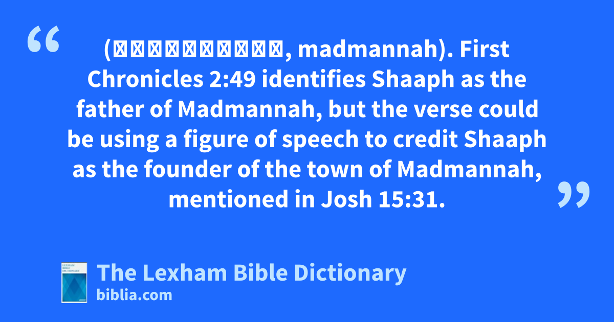 Madmannah, Son of Shaaph (מַדְמַנָּה, madmannah). First Chronicles 2:49 identifies Shaaph as the father of Madmannah, but the verse could be using a figure of speech to credit Shaaph as the founder of the town of Madmannah, mentioned in Josh 15:31.