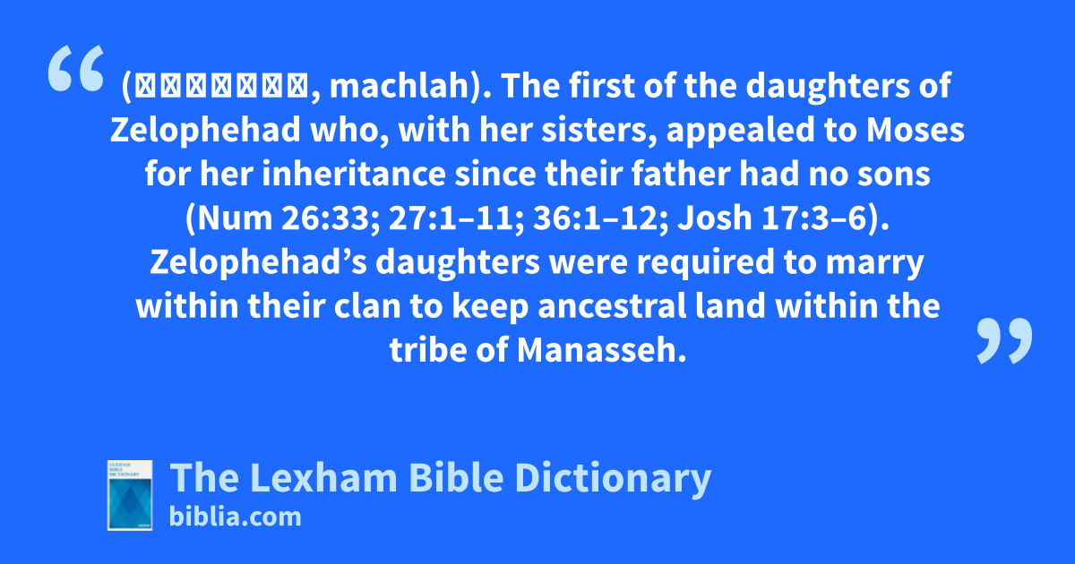 Mahlah, Daughter of Zelophehad (מַחְלָה, machlah). The first of the daughters of Zelophehad who, with her sisters, appealed to Moses for her inheritance since their father had no sons (Num 26:33; 27:1–11; 36:1–12; Josh 17:3–6). Zelophehad’s daughters were required to marry within their clan to keep ancestral land within the tribe of Manasseh.