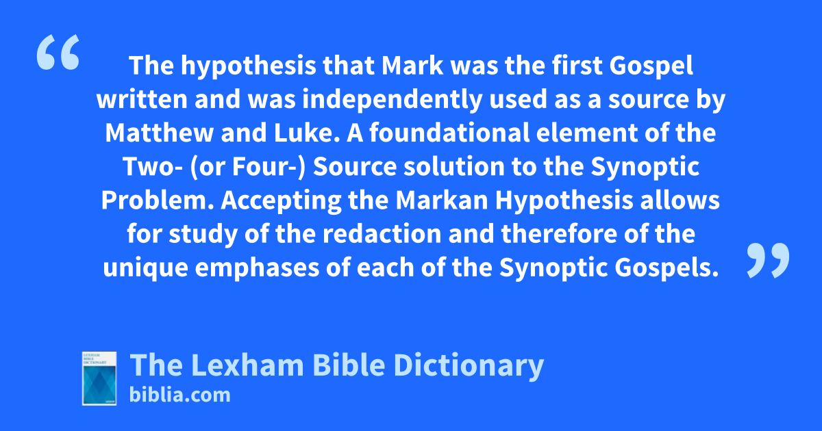 Markan Hypothesis The hypothesis that Mark was the first Gospel written and was independently used as a source by Matthew and Luke. A foundational element of the Two- (or Four-) Source solution to the Synoptic Problem. Accepting the Markan Hypothesis allows for study of the redaction and therefore of the unique emphases of each of the Synoptic Gospels.