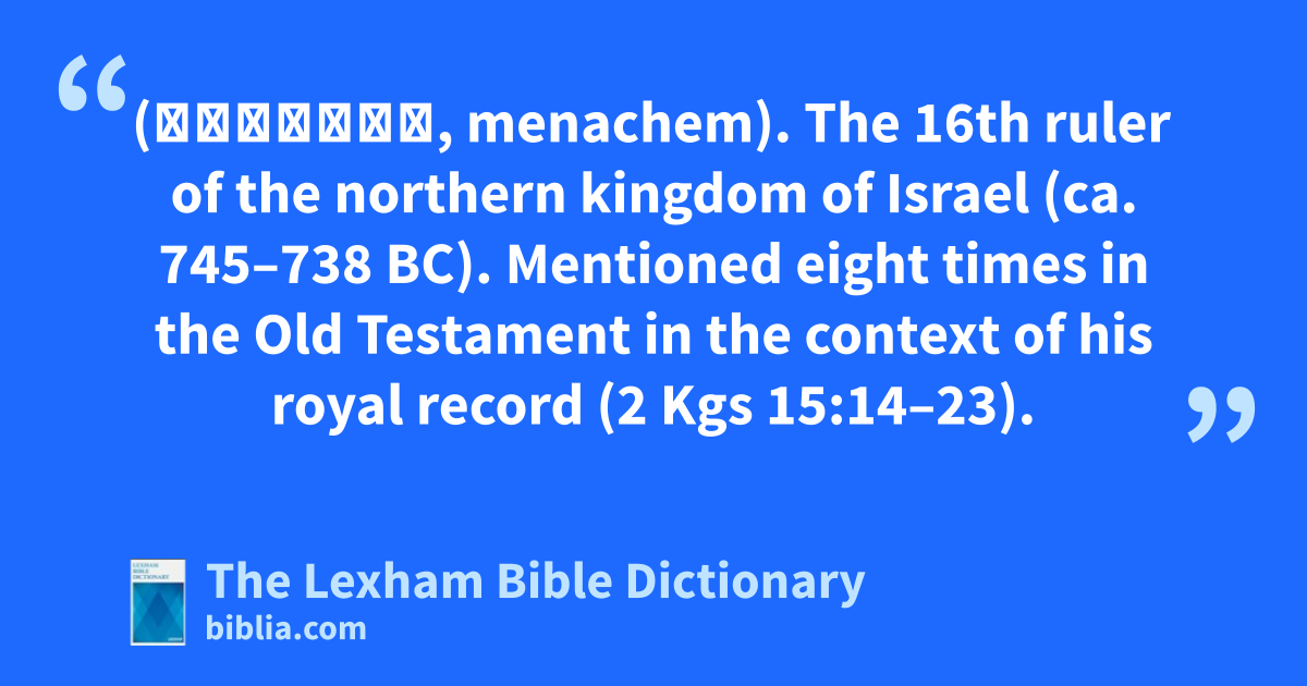 Menahem, King of Israel (מְנַחֵם, menachem). The 16th ruler of the northern kingdom of Israel (ca. 745–738 bc). Mentioned eight times in the Old Testament in the context of his royal record (2 Kgs 15:14–23).
