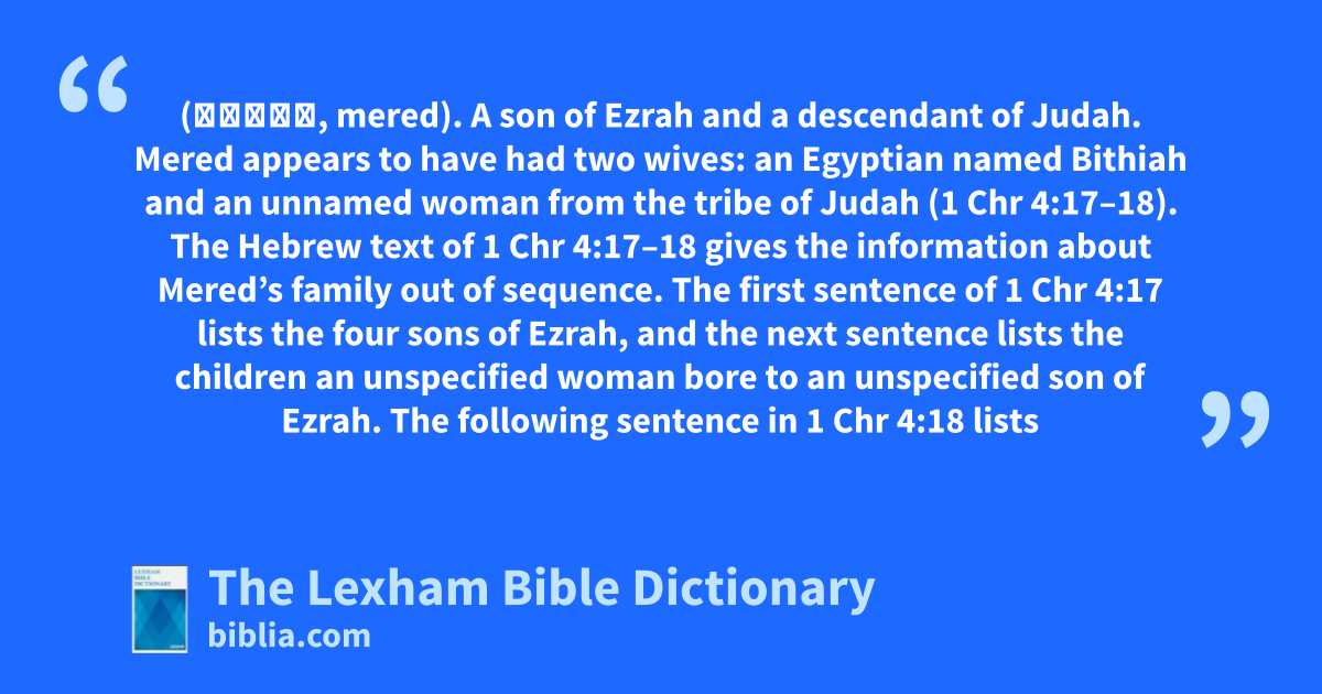 Mered, Son of Ezrah (מֶרֶד, mered). A son of Ezrah and a descendant of Judah. Mered appears to have had two wives: an Egyptian named Bithiah and an unnamed woman from the tribe of Judah (1 Chr 4:17–18). The Hebrew text of 1 Chr 4:17–18 gives the information about Mered’s family out of sequence. The first sentence of 1 Chr 4:17 lists the four sons of Ezrah, and the next sentence lists the children an unspecified woman bore to an unspecified son of Ezrah. The following sentence in 1 Chr 4:18 lists the sons that “his Judahite wife” bore (but the antecedent of “his” is unclear). The verse ends with the statement: “These were the sons of Bithiah daughter of Pharaoh, whom Mered married.” It appears likely that this last clause is displaced and should follow the initial list of Ezrah’s sons in 1 Chr 4:17. This sequence presents the information about Mered’s family in a more comprehensible way: “The sons of Ezrah: Jether, Mered, Epher, and Jalon. And these were the sons of Bithiah daughter of Pharaoh, whom Mered married: And she became pregnant with Miriam, Shammai, and Ishbah, the father of Eshtemoa. And his Judahite wife bore Jered the father of Gedor, Heber the father of Soco, and Jekuthiel the father of Zanoah.”