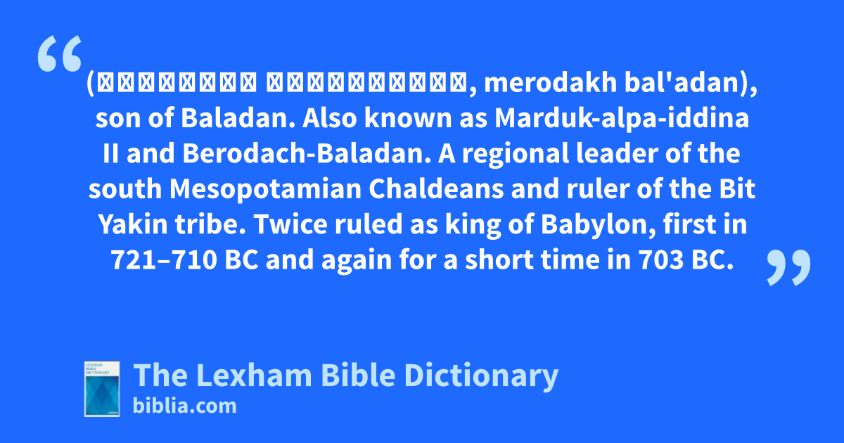 Merodach-Baladan, Son of Baladan (מְרֹדַךְ בַּלְאֲדָן, merodakh bal'adan), son of Baladan. Also known as Marduk-alpa-iddina II and Berodach-Baladan. A regional leader of the south Mesopotamian Chaldeans and ruler of the Bit Yakin tribe. Twice ruled as king of Babylon, first in 721–710 bc and again for a short time in 703 bc.