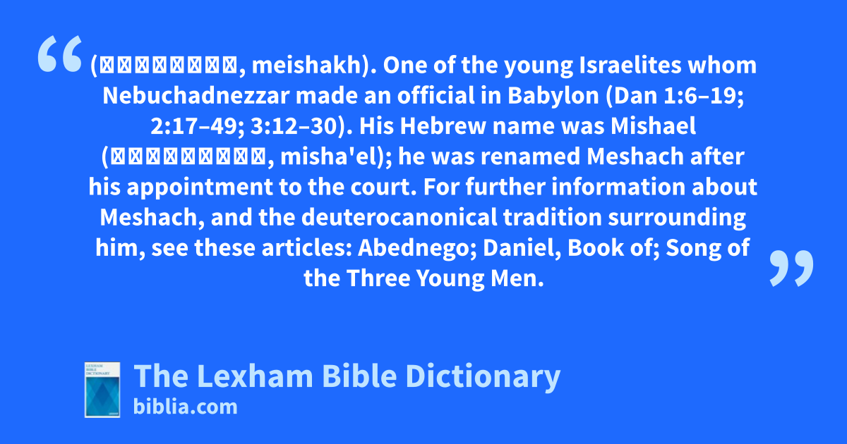 Meshach (מֵישַׁךְ, meishakh). One of the young Israelites whom Nebuchadnezzar made an official in Babylon (Dan 1:6–19; 2:17–49; 3:12–30). His Hebrew name was Mishael (מִישָׁאֵל, misha'el); he was renamed Meshach after his appointment to the court. For further information about Meshach, and the deuterocanonical tradition surrounding him, see these articles: Abednego; Daniel, Book of; Song of the Three Young Men.