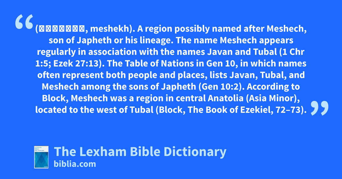 The name Meshech appears regularly in association with the names Javan and Tubal (1 Chr 1:5; Ezek 27:13). The Table of Nations in Gen 10, in which names often represent both people and places, lists Javan, Tubal, and Meshech among the sons of Japheth (Gen 10:2). According to Block, Meshech was a region in central Anatolia (Asia Minor), located to the west of Tubal (Block, The Book of Ezekiel, 72–73). His identification of Meshech and Tubal with kingdoms in the interior of Anatolia is based on references in Assyrian sources recording their various conflicts in the region. Ezekiel 27 lists Javan, Meshech, and Tubal among Tyre’s trading partners. These regions were apparently a source of human slaves for the Phoenician traders (Ezek 27:13).