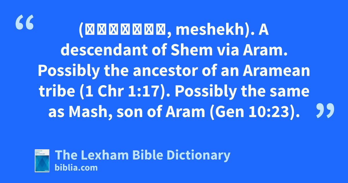 Meshech, Descendant of Shem (מֶשֶׁךְ, meshekh). A descendant of Shem via Aram. Possibly the ancestor of an Aramean tribe (1 Chr 1:17). Possibly the same as Mash, son of Aram (Gen 10:23).
