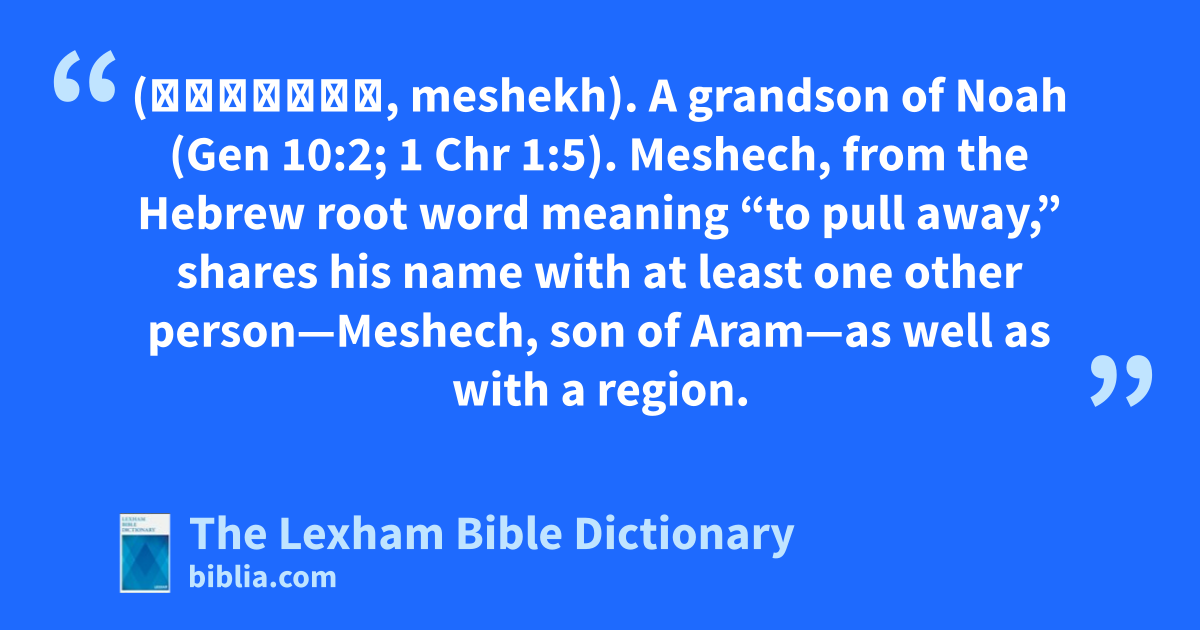 Meshech, Son of Japheth (מֶשֶׁךְ, meshekh). A grandson of Noah (Gen 10:2; 1 Chr 1:5). Meshech, from the Hebrew root word meaning “to pull away,” shares his name with at least one other person—Meshech, son of Aram—as well as with a region.