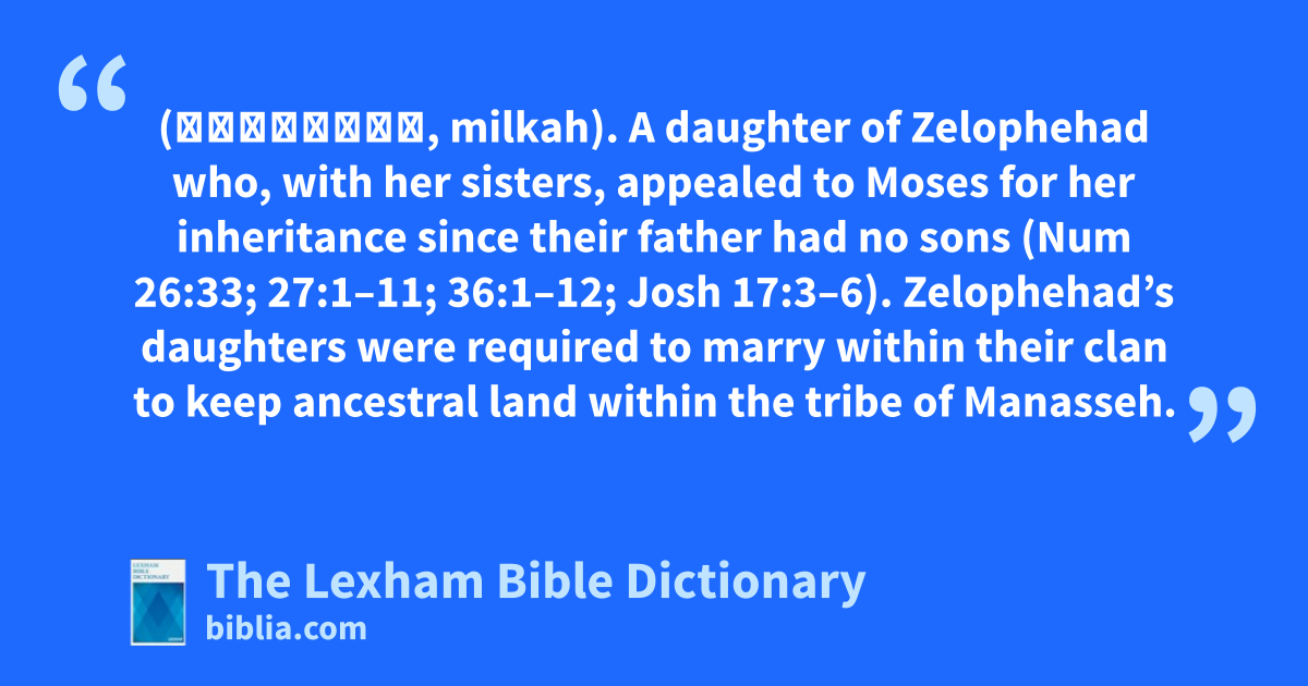 Milcah, Daughter of Zelophehad (מִלְכָּה, milkah). A daughter of Zelophehad who, with her sisters, appealed to Moses for her inheritance since their father had no sons (Num 26:33; 27:1–11; 36:1–12; Josh 17:3–6). Zelophehad’s daughters were required to marry within their clan to keep ancestral land within the tribe of Manasseh.