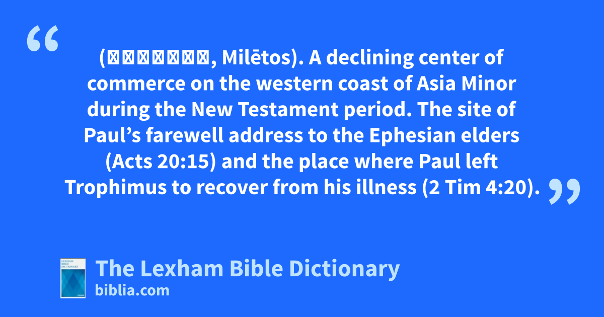 Miletus (Μίλητος, Milētos). A declining center of commerce on the western coast of Asia Minor during the New Testament period. The site of Paul’s farewell address to the Ephesian elders (Acts 20:15) and the place where Paul left Trophimus to recover from his illness (2 Tim 4:20).