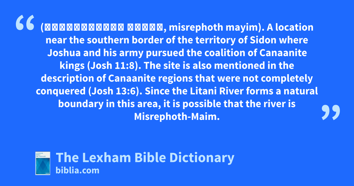Misrephoth-Maim (מִשְׂרְפוֹת מַיִם, misrephoth mayim). A location near the southern border of the territory of Sidon where Joshua and his army pursued the coalition of Canaanite kings (Josh 11:8). The site is also mentioned in the description of Canaanite regions that were not completely conquered (Josh 13:6). Since the Litani River forms a natural boundary in this area, it is possible that the river is Misrephoth-Maim.