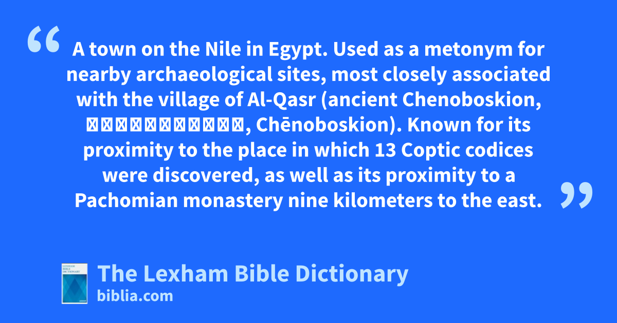 Nag Hammadi A town on the Nile in Egypt. Used as a metonym for nearby archaeological sites, most closely associated with the village of Al-Qasr (ancient Chenoboskion, Χηνοβόσκιον, Chēnoboskion). Known for its proximity to the place in which 13 Coptic codices were discovered, as well as its proximity to a Pachomian monastery nine kilometers to the east.