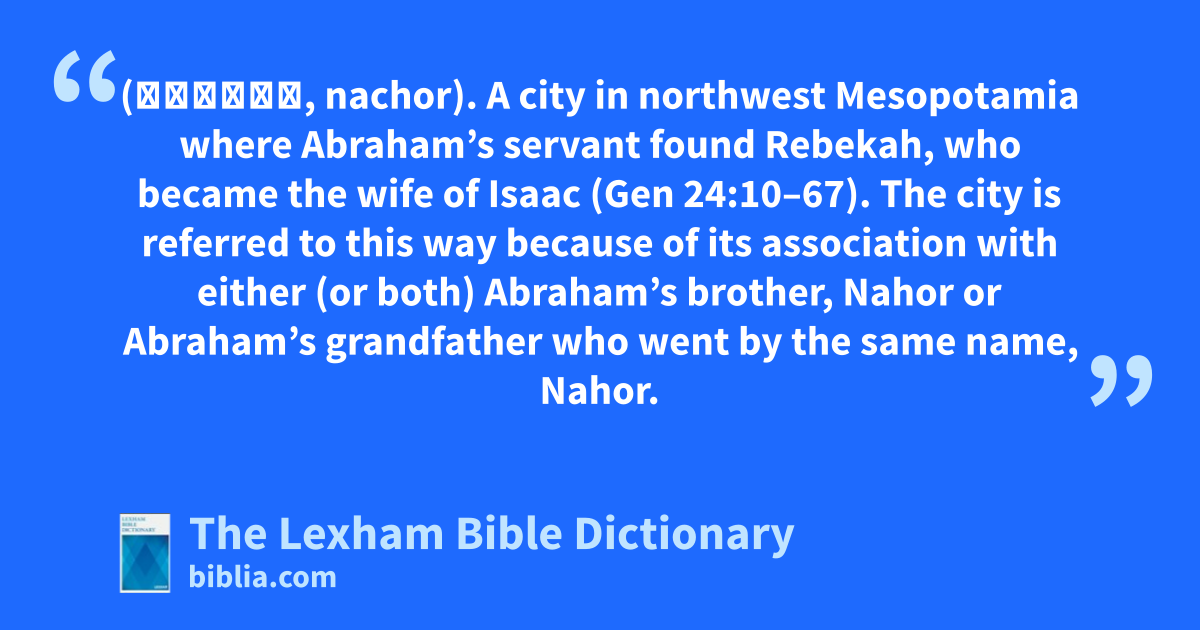 Nahor (נָחוֹר, nachor). A city in northwest Mesopotamia where Abraham’s servant found Rebekah, who became the wife of Isaac (Gen 24:10–67). The city is referred to this way because of its association with either (or both) Abraham’s brother, Nahor or Abraham’s grandfather who went by the same name, Nahor.