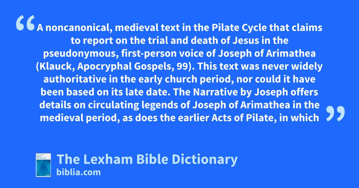Narrative by Joseph of Arimathea A noncanonical, medieval text in the Pilate Cycle that claims to report on the trial and death of Jesus in the pseudonymous, first-person voice of Joseph of Arimathea (Klauck, Apocryphal Gospels, 99). This text was never widely authoritative in the early church period, nor could it have been based on its late date.