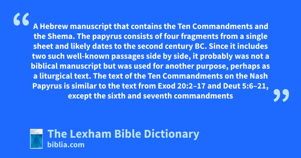 Nash Papyrus A Hebrew manuscript that contains the Ten Commandments and the Shema. The papyrus consists of four fragments from a single sheet and likely dates to the second century bc. Since it includes two such well-known passages side by side, it probably was not a biblical manuscript but was used for another purpose, perhaps as a liturgical text.