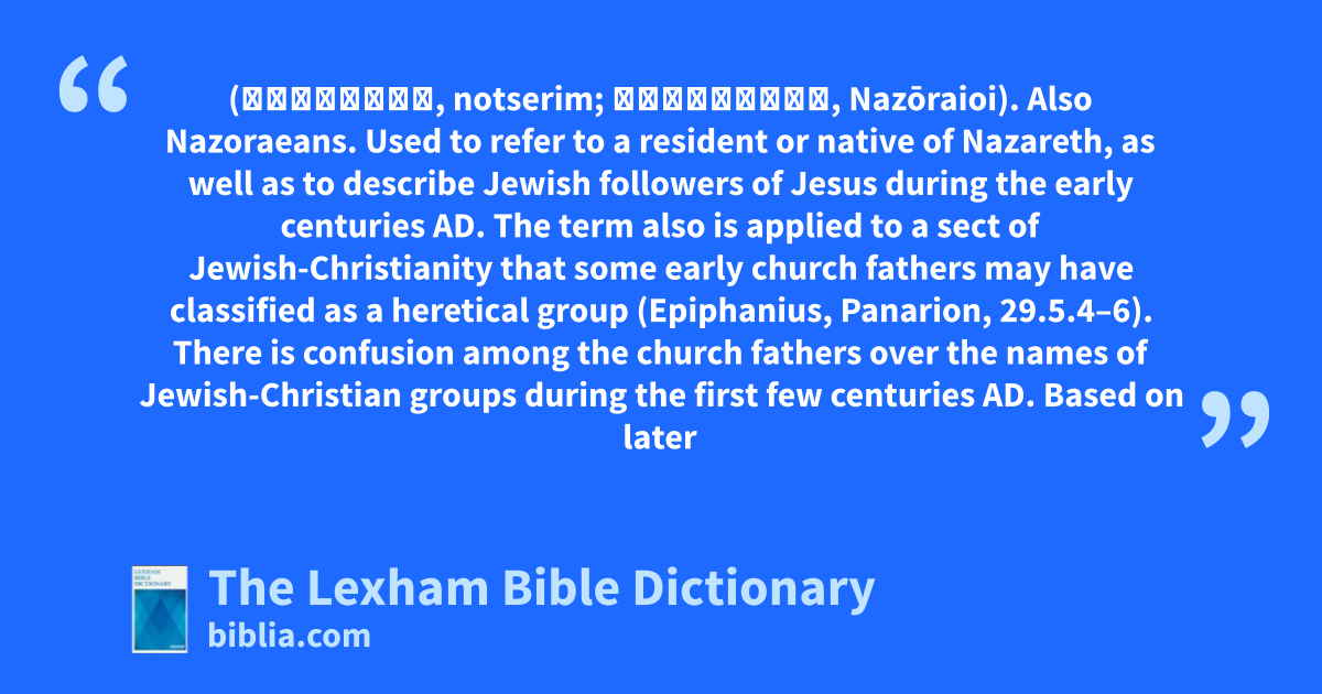 Nazarenes (נֹצְרִים, notserim; Ναζωραίοί, Nazōraioi). Also Nazoraeans. Used to refer to a resident or native of Nazareth, as well as to describe Jewish followers of Jesus during the early centuries ad. The term also is applied to a sect of Jewish-Christianity that some early church fathers may have classified as a heretical group (Epiphanius, Panarion, 29.5.4–6).