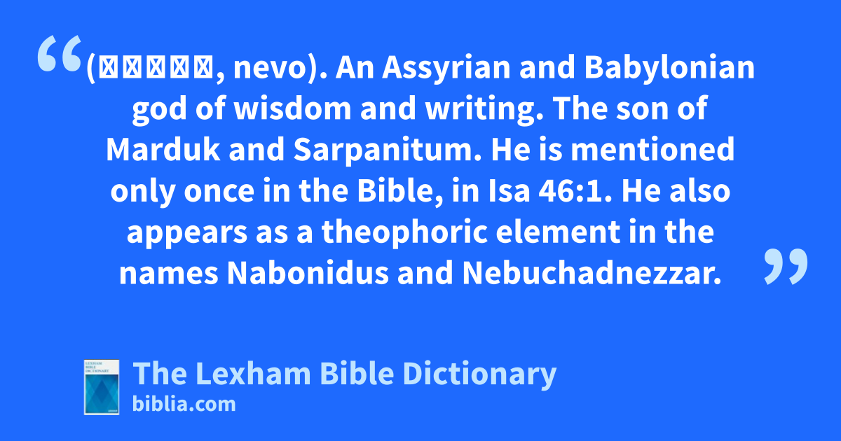 Nebo, Deity (נְבוֹ, nevo). An Assyrian and Babylonian god of wisdom and writing. The son of Marduk and Sarpanitum. He is mentioned only once in the Bible, in Isa 46:1. He also appears as a theophoric element in the names Nabonidus and Nebuchadnezzar.