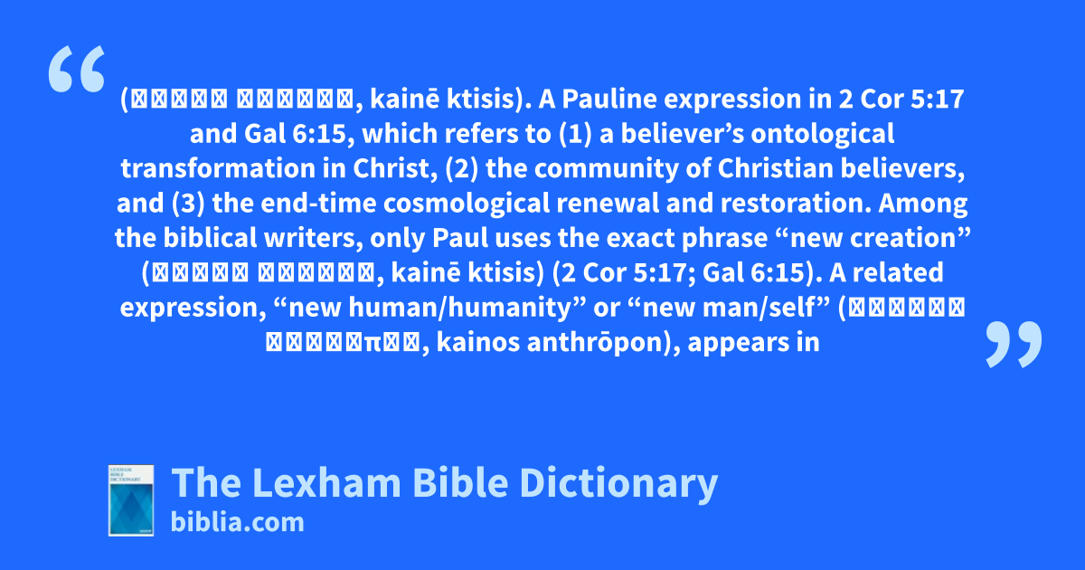New Creation (καινὴ κτίσις, kainē ktisis). A Pauline expression in 2 Cor 5:17 and Gal 6:15, which refers to (1) a believer’s ontological transformation in Christ, (2) the community of Christian believers, and (3) the end-time cosmological renewal and restoration.