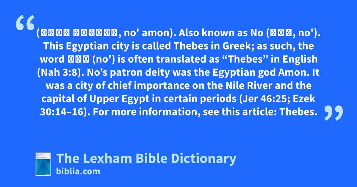 No-Amon (נֹּא אָמוֹן, no' amon). Also known as No (נֹא, no'). This Egyptian city is called Thebes in Greek; as such, the word נֹא (no') is often translated as “Thebes” in English (Nah 3:8). No’s patron deity was the Egyptian god Amon. It was a city of chief importance on the Nile River and the capital of Upper Egypt in certain periods (Jer 46:25; Ezek 30:14–16). For more information, see this article: Thebes.