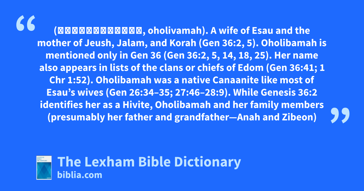 Oholibamah, Daughter of Anah (אָהֳלִיבָמָה, oholivamah). A wife of Esau and the mother of Jeush, Jalam, and Korah (Gen 36:2, 5). Oholibamah is mentioned only in Gen 36 (Gen 36:2, 5, 14, 18, 25). Her name also appears in lists of the clans or chiefs of Edom (Gen 36:41; 1 Chr 1:52). Oholibamah was a native Canaanite like most of Esau’s wives (Gen 26:34–35; 27:46–28:9). While Genesis 36:2 identifies her as a Hivite, Oholibamah and her family members (presumably her father and grandfather—Anah and Zibeon) appear in the genealogy of the descendants of Seir the Horite in Gen 36:20–30. The “Hivites” (חִוִּי, chiwwiy) and “Horites” (חֹרִי, choriy) may be names for the same native Canaanite people. The Hebrew spellings of the names differ by only one letter, though, so it is also possible there was a scribal error and that “Horite” was meant in Gen 36:2. Esau’s later move to the hill country of Seir—the land of the Horites—may have been motivated by the kinship ties established through his marriage to Oholibamah (Gen 36:6–8, 20–30).