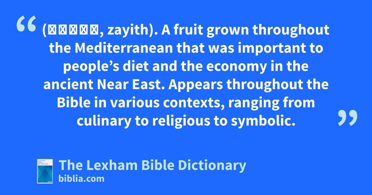 Olive (זַיִת, zayith). A fruit grown throughout the Mediterranean that was important to people’s diet and the economy in the ancient Near East. Appears throughout the Bible in various contexts, ranging from culinary to religious to symbolic.