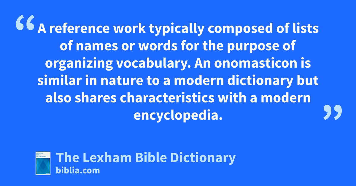 Onomasticon A reference work typically composed of lists of names or words for the purpose of organizing vocabulary. An onomasticon is similar in nature to a modern dictionary but also shares characteristics with a modern encyclopedia.