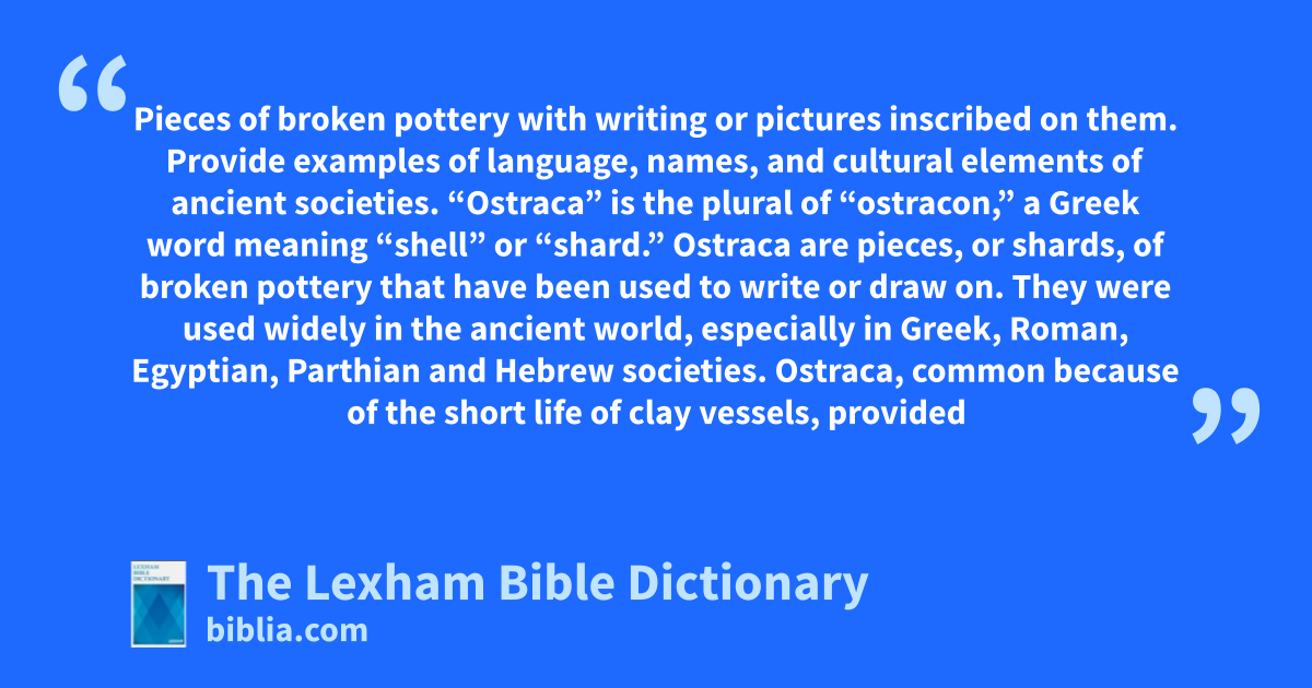 “Ostraca” is the plural of “ostracon,” a Greek word meaning “shell” or “shard.” Ostraca are pieces, or shards, of broken pottery that have been used to write or draw on. They were used widely in the ancient world, especially in Greek, Roman, Egyptian, Parthian and Hebrew societies. Ostraca, common because of the short life of clay vessels, provided writing material that was cheap or free—unlike parchment or papyrus, which was quite expensive. The texts or drawings on ostraca were either written in ink or inscribed by a sharp object. Their relatively small size and hard-wearing nature made them ideal for carrying memos, brief reports, notes, receipts of goods, and tax documents.