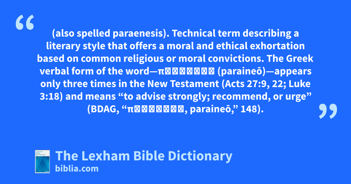Parenesis (also spelled paraenesis). Technical term describing a literary style that offers a moral and ethical exhortation based on common religious or moral convictions. The Greek verbal form of the word—παραινέω (paraineō)—appears only three times in the New Testament (Acts 27:9, 22; Luke 3:18) and means “to advise strongly; recommend, or urge” (BDAG, “παραινέω, paraineō,” 148).