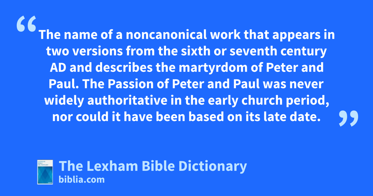 Passion of Peter and Paul The name of a noncanonical work that appears in two versions from the sixth or seventh century ad and describes the martyrdom of Peter and Paul. The Passion of Peter and Paul was never widely authoritative in the early church period, nor could it have been based on its late date.