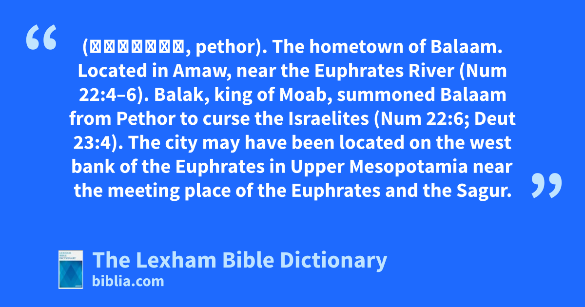 Pethor (פְּתוֹר, pethor). The hometown of Balaam. Located in Amaw, near the Euphrates River (Num 22:4–6). Balak, king of Moab, summoned Balaam from Pethor to curse the Israelites (Num 22:6; Deut 23:4). The city may have been located on the west bank of the Euphrates in Upper Mesopotamia near the meeting place of the Euphrates and the Sagur.