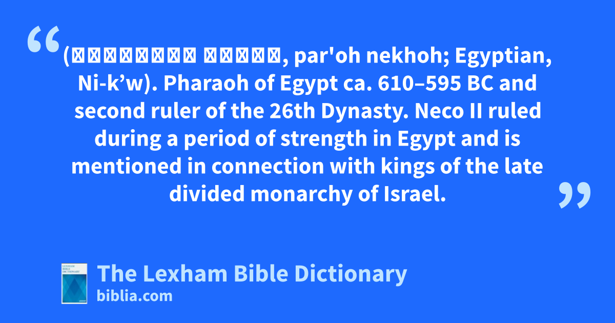 Pharaoh Neco II (פַּרְעֹה נְכֹה, par'oh nekhoh; Egyptian, Ni-k’w). Pharaoh of Egypt ca. 610–595 bc and second ruler of the 26th Dynasty. Neco II ruled during a period of strength in Egypt and is mentioned in connection with kings of the late divided monarchy of Israel.