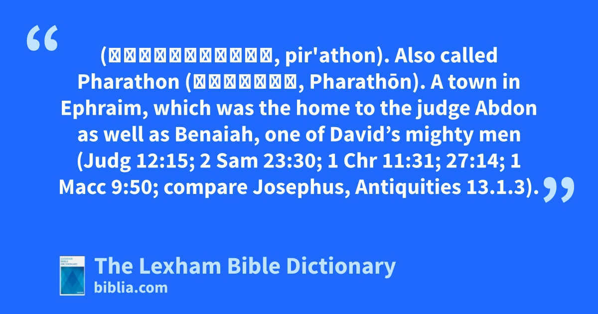 Pirathon (פִּרְעָתוֹן, pir'athon). Also called Pharathon (Φαραθων, Pharathōn). A town in Ephraim, which was the home to the judge Abdon as well as Benaiah, one of David’s mighty men (Judg 12:15; 2 Sam 23:30; 1 Chr 11:31; 27:14; 1 Macc 9:50; compare Josephus, Antiquities 13.1.3).