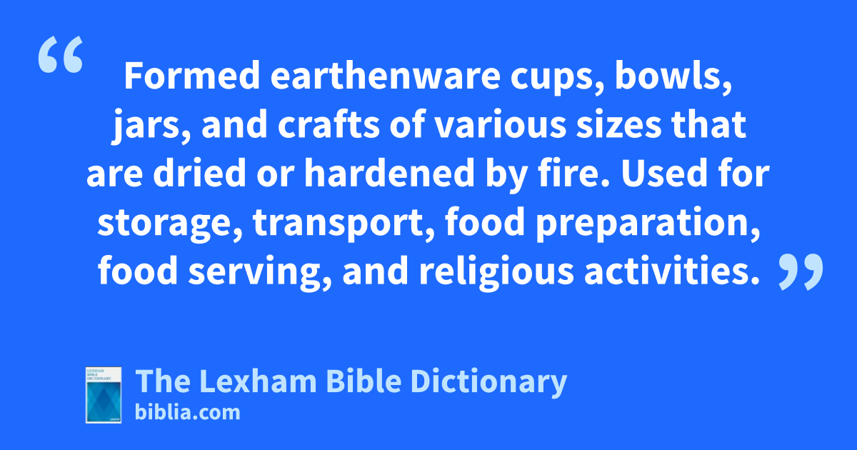 Pottery Formed earthenware cups, bowls, jars, and crafts of various sizes that are dried or hardened by fire. Used for storage, transport, food preparation, food serving, and religious activities.