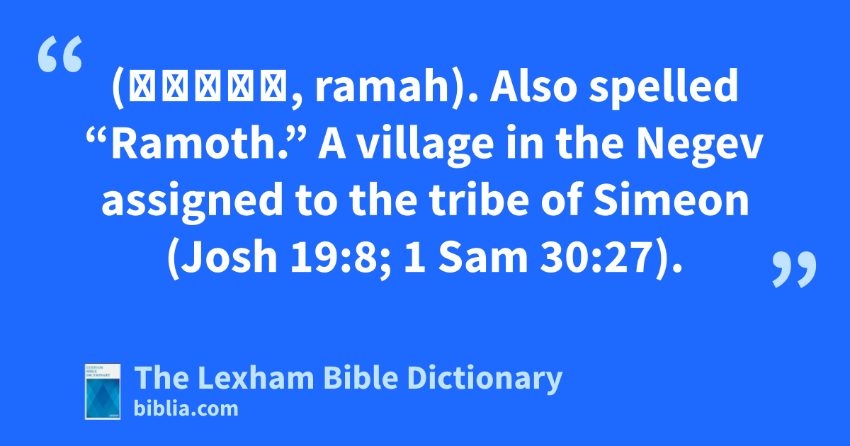 Ramah of the Negev (רָמָה, ramah). Also spelled “Ramoth.” A village in the Negev assigned to the tribe of Simeon (Josh 19:8; 1 Sam 30:27).