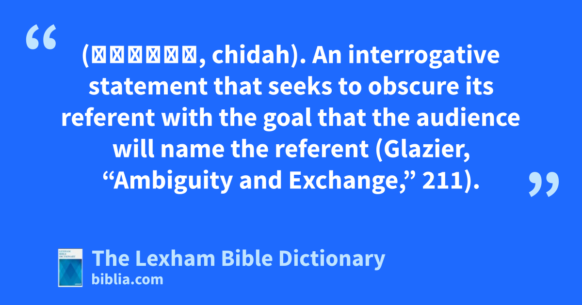 Riddles (חִידָה, chidah). An interrogative statement that seeks to obscure its referent with the goal that the audience will name the referent (Glazier, “Ambiguity and Exchange,” 211).
