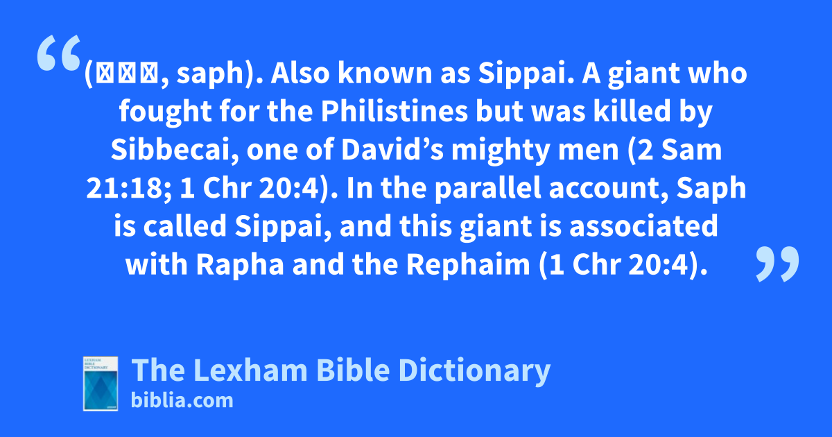Saph (סַף, saph). Also known as Sippai. A giant who fought for the Philistines but was killed by Sibbecai, one of David’s mighty men (2 Sam 21:18; 1 Chr 20:4). In the parallel account, Saph is called Sippai, and this giant is associated with Rapha and the Rephaim (1 Chr 20:4).
