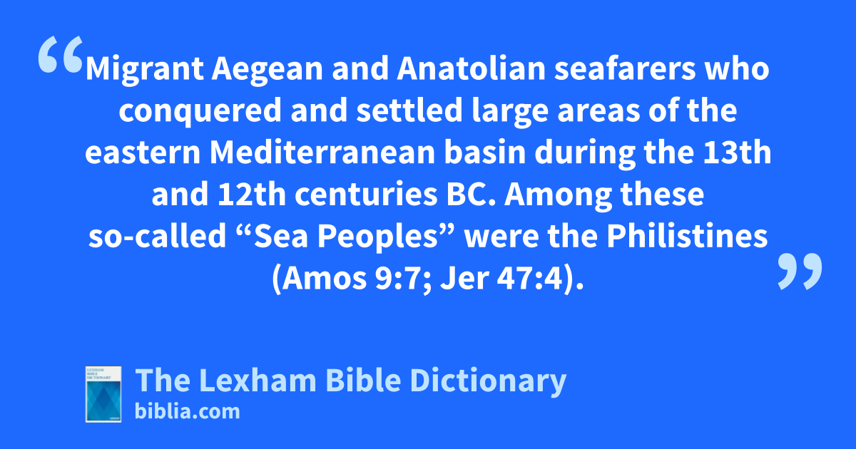 Sea Peoples Migrant Aegean and Anatolian seafarers who conquered and settled large areas of the eastern Mediterranean basin during the 13th and 12th centuries bc. Among these so-called “Sea Peoples” were the Philistines (Amos 9:7; Jer 47:4).