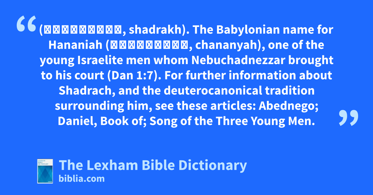 Shadrach (שַׁדְרַךְ, shadrakh). The Babylonian name for Hananiah (חֲנַנְיָה, chananyah), one of the young Israelite men whom Nebuchadnezzar brought to his court (Dan 1:7). For further information about Shadrach, and the deuterocanonical tradition surrounding him, see these articles: Abednego; Daniel, Book of; Song of the Three Young Men.