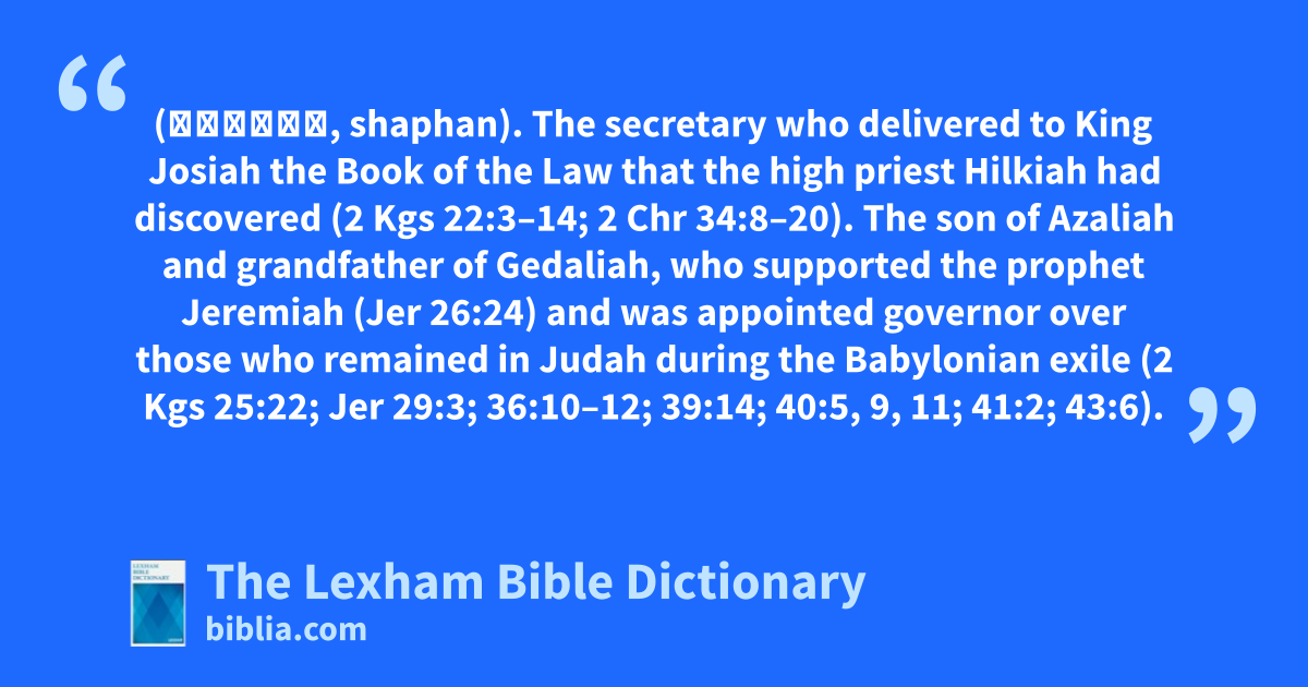 Shaphan the Secretary (שָׁפָן, shaphan). The secretary who delivered to King Josiah the Book of the Law that the high priest Hilkiah had discovered (2 Kgs 22:3–14; 2 Chr 34:8–20). The son of Azaliah and grandfather of Gedaliah, who supported the prophet Jeremiah (Jer 26:24) and was appointed governor over those who remained in Judah during the Babylonian exile (2 Kgs 25:22; Jer 29:3; 36:10–12; 39:14; 40:5, 9, 11; 41:2; 43:6).