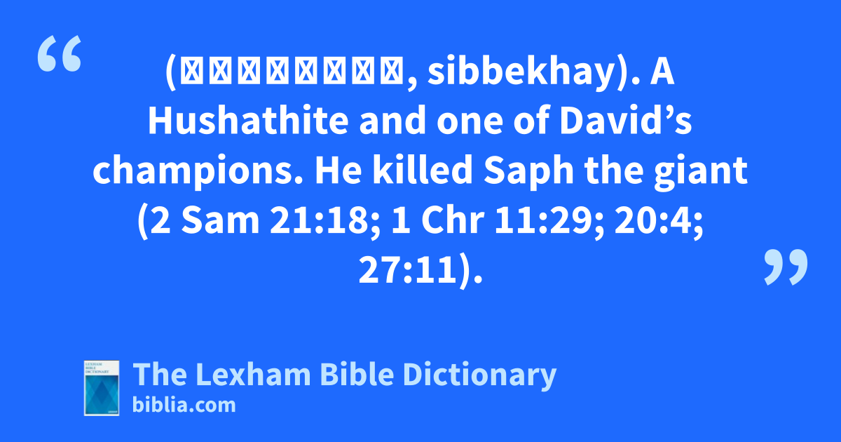 Sibbecai (סִבְּכַי, sibbekhay). A Hushathite and one of David’s champions. He killed Saph the giant (2 Sam 21:18; 1 Chr 11:29; 20:4; 27:11).