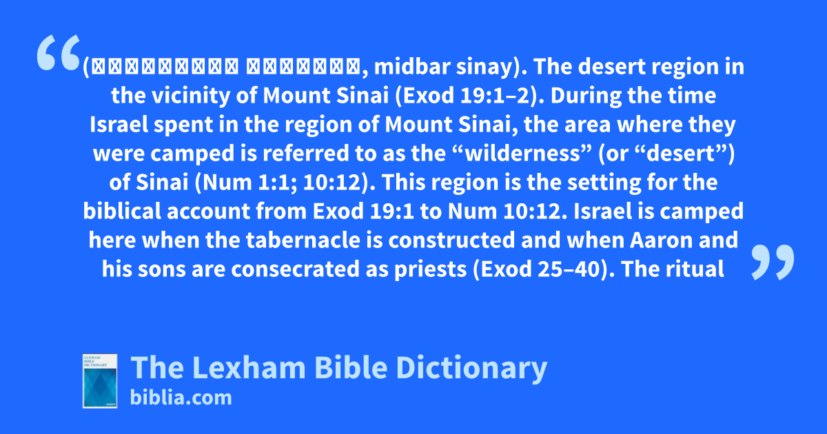 Sinai, Wilderness Of (מִדְבַּ֥ר סִינָֽי, midbar sinay). The desert region in the vicinity of Mount Sinai (Exod 19:1–2). During the time Israel spent in the region of Mount Sinai, the area where they were camped is referred to as the “wilderness” (or “desert”) of Sinai (Num 1:1; 10:12). This region is the setting for the biblical account from Exod 19:1 to Num 10:12. Israel is camped here when the tabernacle is constructed and when Aaron and his sons are consecrated as priests (Exod 25–40). The ritual and sacrificial laws of Leviticus related to the priests and the tabernacle are also set here (Lev 7:38). After approximately a year, the Israelites break camp at Sinai and journey to the wilderness of Paran (Num 10:12). For more information on Israel in the wilderness, see this article: Wilderness Wanderings.