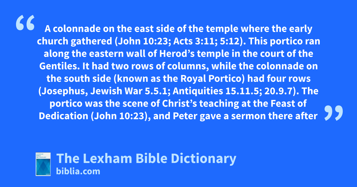 This portico ran along the eastern wall of Herod’s temple in the court of the Gentiles. It had two rows of columns, while the colonnade on the south side (known as the Royal Portico) had four rows (Josephus, Jewish War 5.5.1; Antiquities 15.11.5; 20.9.7). The portico was the scene of Christ’s teaching at the Feast of Dedication (John 10:23), and Peter gave a sermon there after his healing of the lame man (Acts 3:11). The early church gathered and the apostles performed miracles there (Acts 5:12).