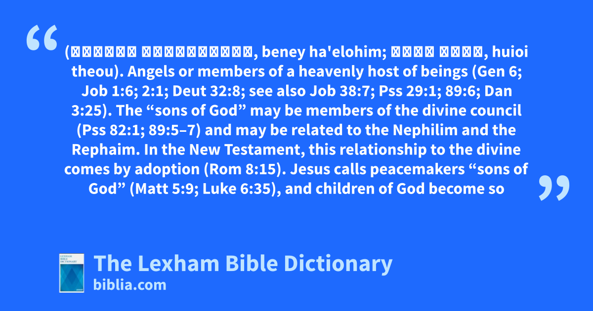 Sons of God (בְּנֵי הָאֱלֹהִים, beney ha'elohim; υἱοὶ θεοῦ, huioi theou). Angels or members of a heavenly host of beings (Gen 6; Job 1:6; 2:1; Deut 32:8; see also Job 38:7; Pss 29:1; 89:6; Dan 3:25). The “sons of God” may be members of the divine council (Pss 82:1; 89:5–7) and may be related to the Nephilim and the Rephaim. In the New Testament, this relationship to the divine comes by adoption (Rom 8:15). Jesus calls peacemakers “sons of God” (Matt 5:9; Luke 6:35), and children of God become so through faith in the Son of God (Rom 8; Gal 3:26).
