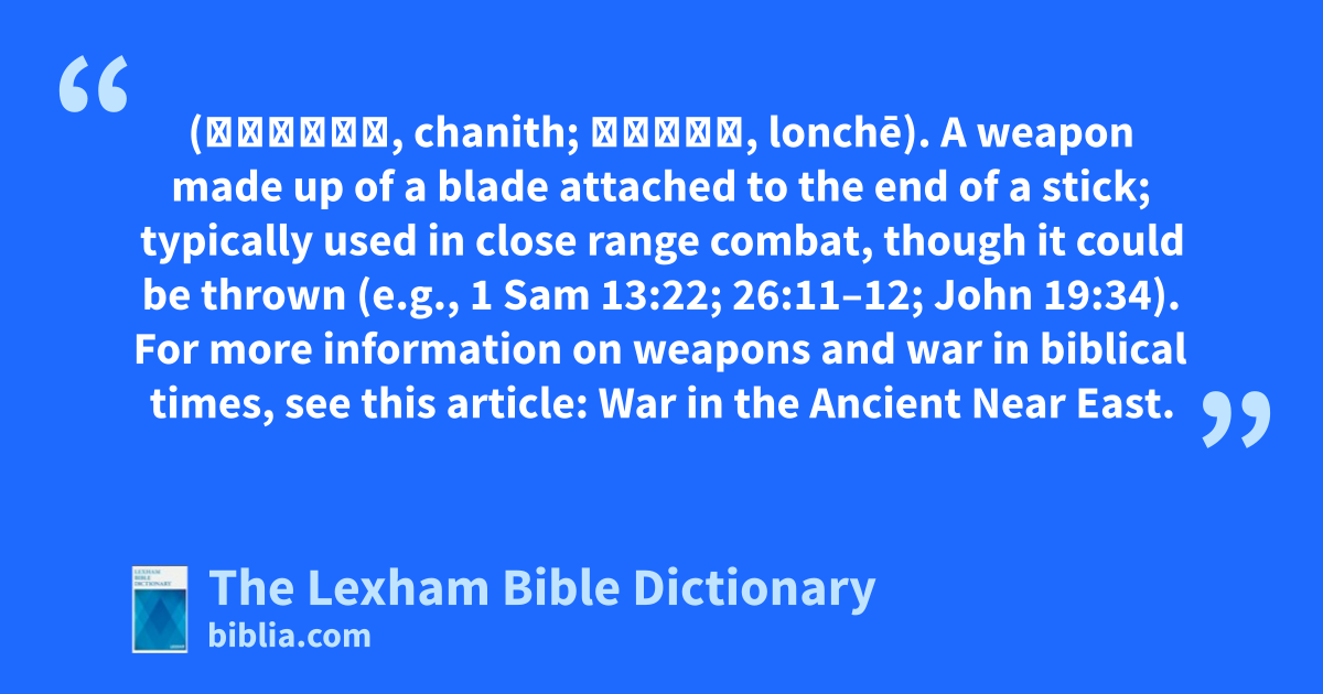 Spear (חֲנִית, chanith; λόγχη, lonchē). A weapon made up of a blade attached to the end of a stick; typically used in close range combat, though it could be thrown (e.g., 1 Sam 13:22; 26:11–12; John 19:34). For more information on weapons and war in biblical times, see this article: War in the Ancient Near East.