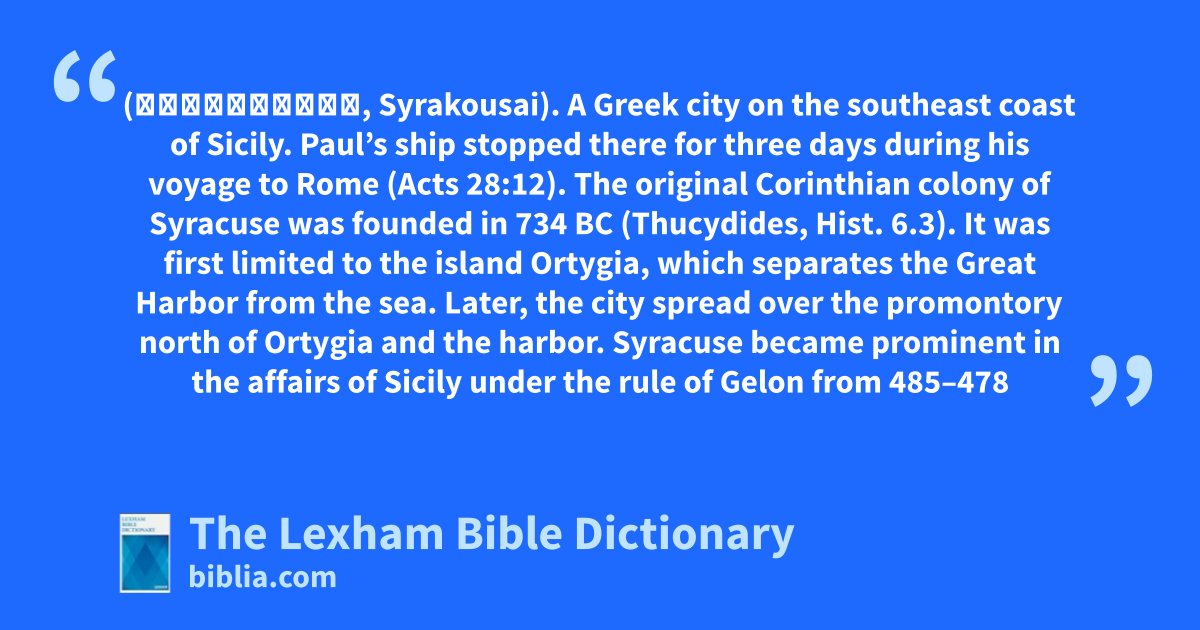 Syracuse (Συράκουσαι, Syrakousai). A Greek city on the southeast coast of Sicily. Paul’s ship stopped there for three days during his voyage to Rome (Acts 28:12).