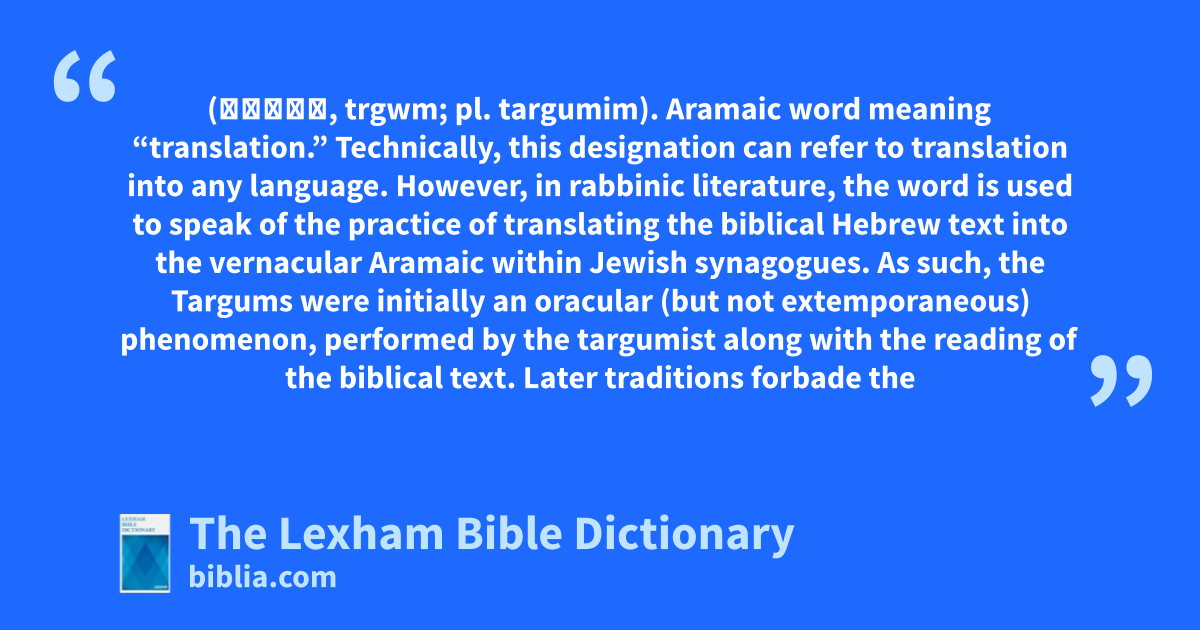 Targum (תרגום, trgwm; pl. targumim). Aramaic word meaning “translation.” Technically, this designation can refer to translation into any language. However, in rabbinic literature, the word is used to speak of the practice of translating the biblical Hebrew text into the vernacular Aramaic within Jewish synagogues. As such, the Targums were initially an oracular (but not extemporaneous) phenomenon, performed by the targumist along with the reading of the biblical text. Later traditions forbade the use of a written targum within the synagogue’s liturgical practices (Targum Pseudo-Jonathan Megillah 4:1, 74d).