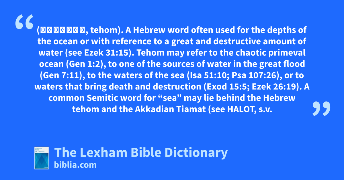 Tehom may refer to the chaotic primeval ocean (Gen 1:2), to one of the sources of water in the great flood (Gen 7:11), to the waters of the sea (Isa 51:10; Psa 107:26), or to waters that bring death and destruction (Exod 15:5; Ezek 26:19). A common Semitic word for “sea” may lie behind the Hebrew tehom and the Akkadian Tiamat (see HALOT, s.v. תְּהוֹם, tehom). The possible connection is important since Tiamat figures prominently as Marduk’s adversary in the Mesopotamian creation epic, Enuma Elish. Tehom is sometimes used in biblical contexts that evoke this common imagery from ancient Near Eastern mythology (e.g., the Chaoskampf motif). However, many Old Testament references to tehom are simply natural references to the ocean depths or other water sources.