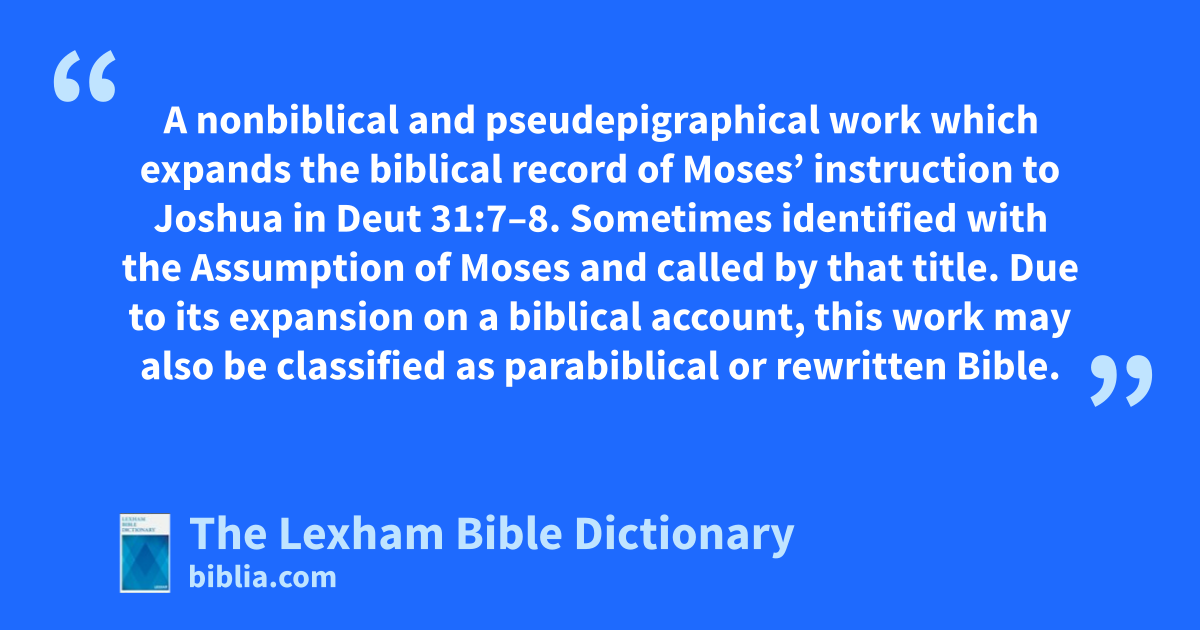 Testament of Moses A nonbiblical and pseudepigraphical work which expands the biblical record of Moses’ instruction to Joshua in Deut 31:7–8. Sometimes identified with the Assumption of Moses and called by that title. Due to its expansion on a biblical account, this work may also be classified as parabiblical or rewritten Bible.